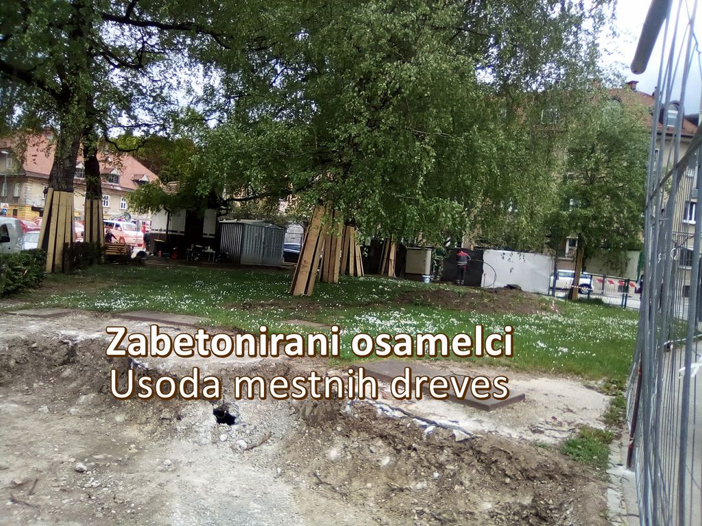Prizor na fotografiji me je ganil. Nekaj drevesnih mladik nasproti kina Vič je bilo, ob gradbenem razdejanju okoli njih, zavarovano z lesenimi deskami, ki sporočajo, da je tam nekdo, ki jih čuti in ščiti. Zdi se žalosten poskus podaljšane agonije, ki je še skrčil svoj jekleno-betonski objem in pet mladih dreves obsodil na počasno rast in stagnacijo brez podpore sorodnih bitij, podpornih rastlin in koreninsko-gljivičnega sistema.