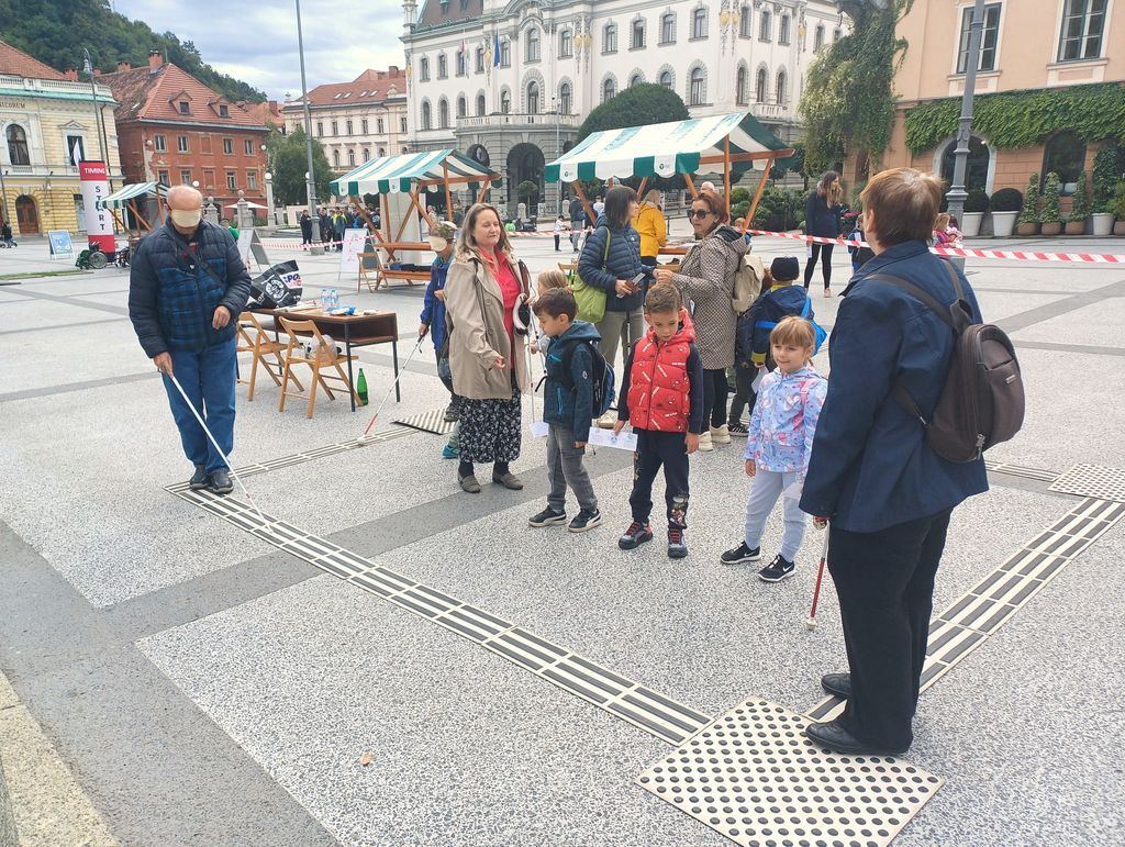 Medtem ko se osebe z okvaro sluha največ soočajo s težavami v komunikaciji, pa se osebe z motnjami vida spoprijemajo z oteženo mobilnostjo. Slavica Bukovec Zupanič iz Medobčinskega društva slepih in slabovidnih Ljubljana je razložila: »Mi danes prikazujemo ovire, s katerimi se srečujemo slepi in slabovidni v življenju in prometu, da bi mimoidoči prepoznali naše težave in nam pri tem morda tudi lažje pomagali, če to želijo. Predstavljamo družabne igre in pripomočke za slepe, brajico, zvočne opise in branje v povečanem tisku – ljudje se še posebej radi preizkušajo pri hoji z belo palico in zakritimi očmi na poligonu iz taktilnih oznak. Tekstura tal je namreč za slepe zelo pomembna, da vemo, kje je pločnik, kje zelenica. V Ljubljani je to perfektno urejeno, saj so na večjih površinah, ploščadih in ob prometnih cestah, na primer ob Dunajski in Slovenski cesti, nameščene taktilne oznake za boljšo orientacijo.« Pomembno je tudi, da so taktilne oznake kvalitetno izdelane in položene, kanali pa sproti očiščeni in vzdrževani, tako da lahko bela palica lepo drsi po liniji taktilne poti.
