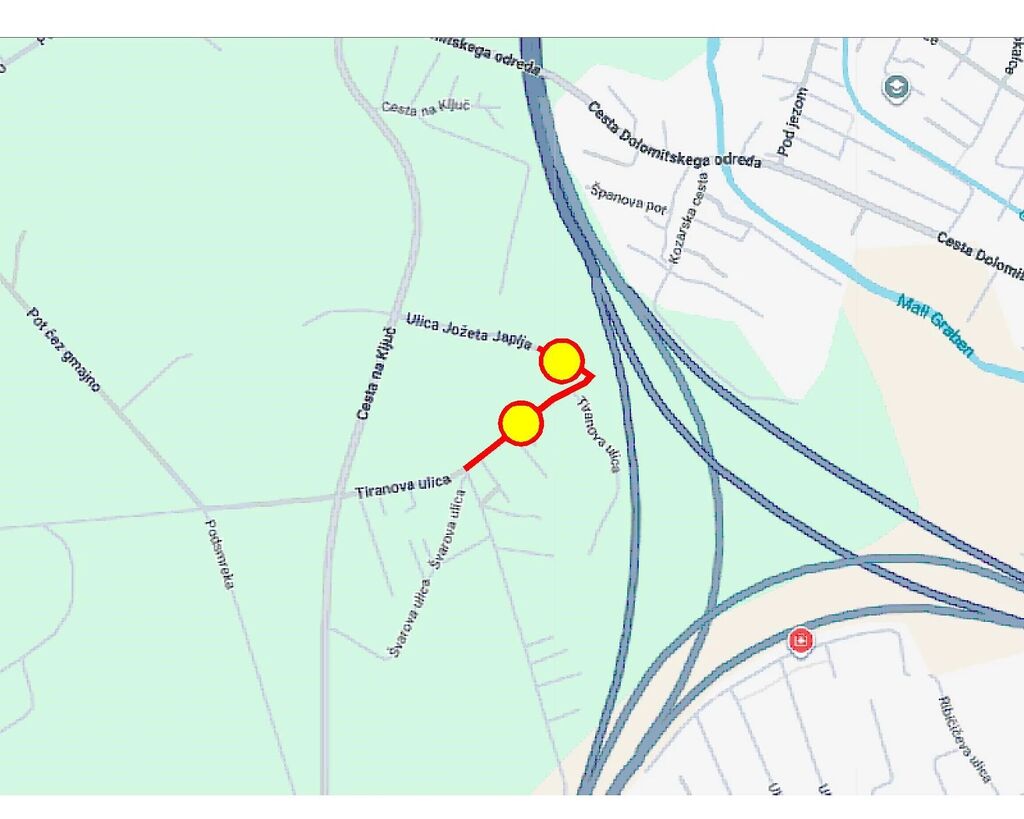 Zaradi izgradnje komunalne infrastrukture bo od 26. januarja do predvidoma 26. marca 2026 popolna zapora Tiranove ulice in Ulice Jožeta Japlja med Trinkovo ulico in Cesto na Ključ.