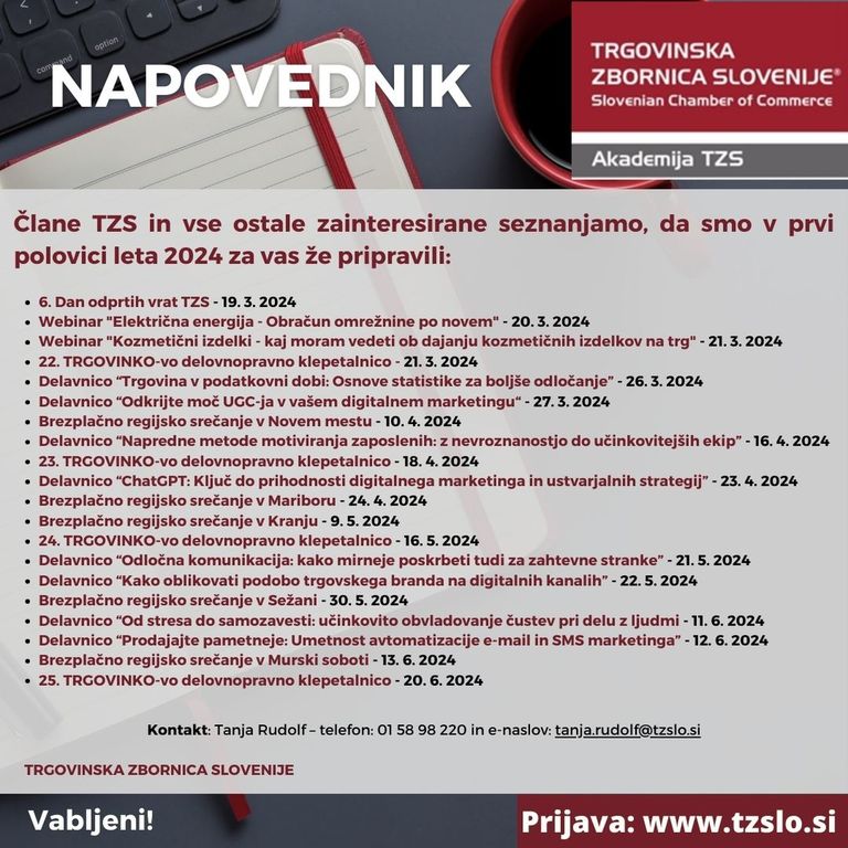 Vljudno vabljeni, da se nam pridružite na seminarjih in delavnicah, ki jih Trgovinska zbornica Slovenije organizira v prvi polovici leta 2024 za člane TZS in vse ostale zainteresirane!
