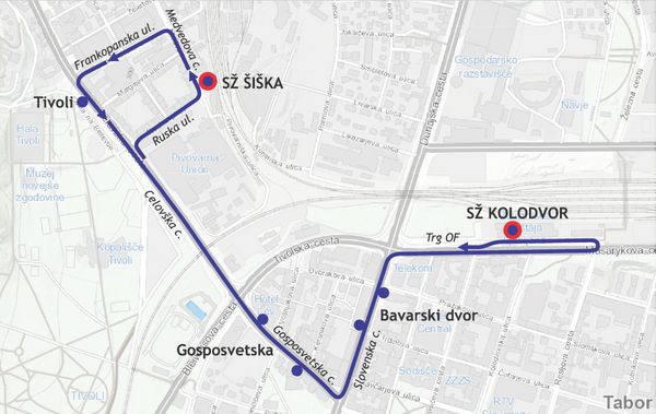 Priporočen obvoz bo označen tako, da bodo vozniki z Dunajske ceste vodeni po Samovi, Drenikovi, Celovški in Tivolski cesti (in v obratni smeri);