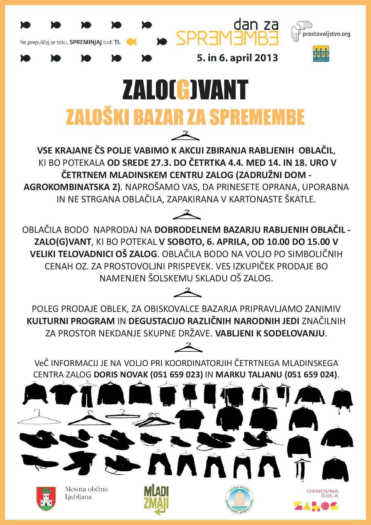 Četrtni mladinski center Zalog - ČaMaC, ki deluje v okviru Javnega zavoda Mladi zmaji - Centra za kakovostno preživljanje prostega časa otrok in mladih, katerega ustanoviteljica je Mestna občina Ljubljana, v sodelovanju z Osnovno šolo Zalog, Četrtno skupnostjo Polje in Civilno iniciativo Spodnji Kašelj - Podgrad - Zalog v okviru Dneva za spremembe organizira akcijo zbiranja oblačil in dobrodelno prireditev ZALO(G)VANT - ZALOŠKI BAZAR ZA SPREMEMBE.