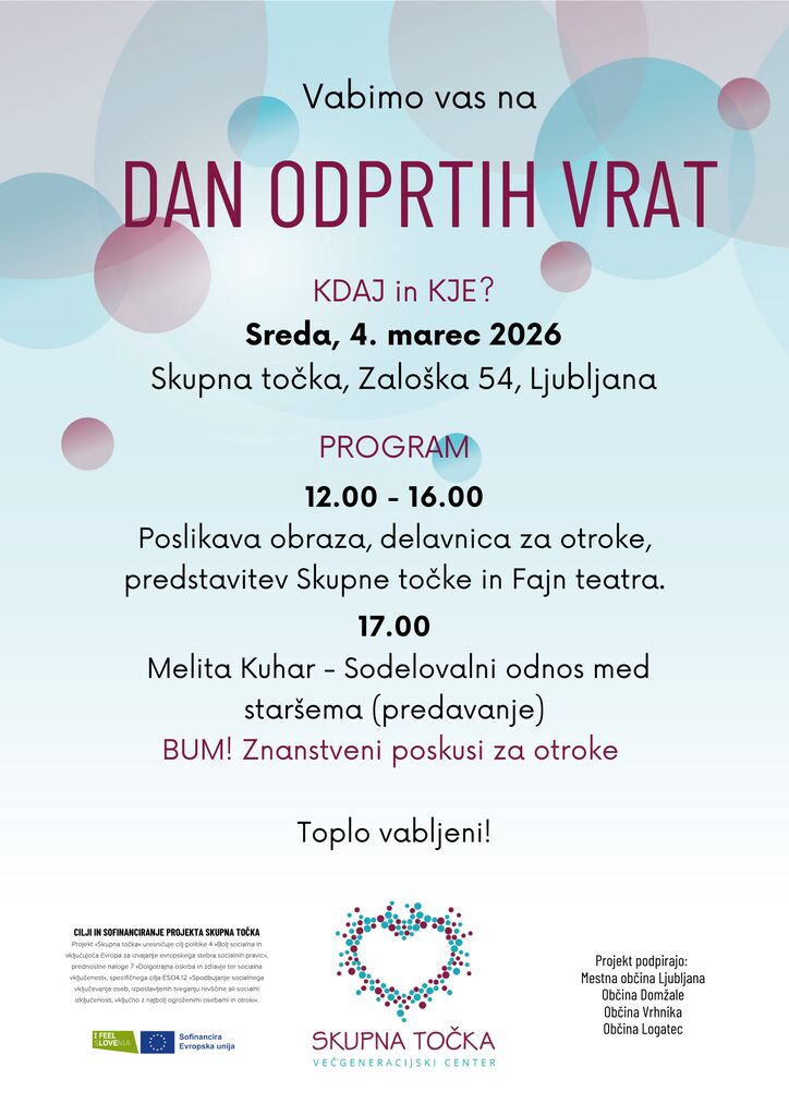 V sredo, 4. marca, odpiramo vrata Večgeneracijskega centra Skupna točka. Od 12. ure naprej vas bo čakal pester program aktivnosti za vse starosti: od ustvarjalnih in znanstvenih delavnic za otroke do predstavitev delovanja Skupne točke. Za starše bo lahko še posebej zanimivo predavanje Melite Kuhar, strokovnjakinje za partnersko in družinsko problematiko ter za vzgojo otrok.