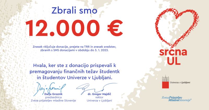 Univerza v Ljubljani je s 4. januarjem 2023 zaključila večmesečno akcijo Srčna UL, katere namen je bil reševanje kratkoročnih finančnih težav študentk in študentov, ki zaradi aktualnih razmer s svojimi dohodki ne morejo kriti življenjskih stroškov ali stroškov, povezanih s študijem. V sklopu projekta, izvedenega v sodelovanju z Zvezo prijateljev mladine, smo zbrali 12.000 evrov, ki bodo namenjeni tistim v finančni stiski.