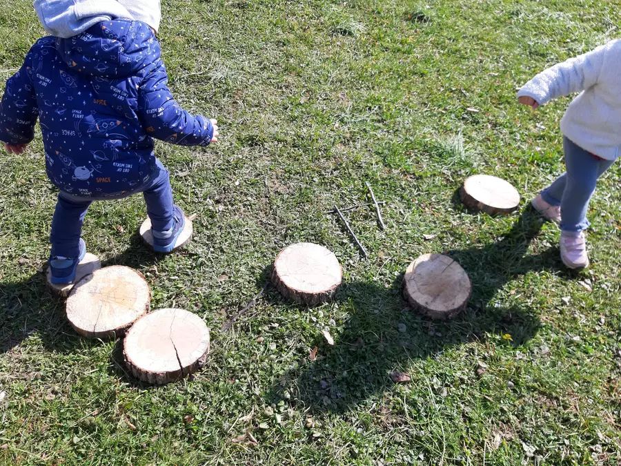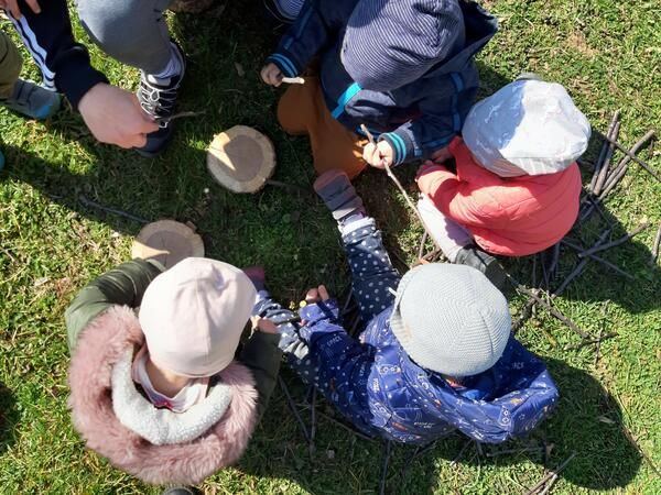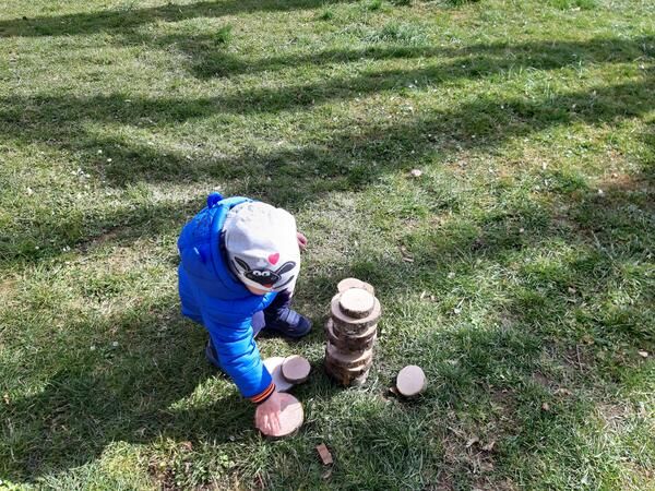 »Dobili smo veliko vej in tudi drevesne kolute, ki jih bomo uporabljali v našem kotičku z naravnimi materiali na dvorišču vrtca. Veje smo narezale na palčke in palice in otroci se z njimi igrajo. Vrtajo luknjice v tla, jih prenašajo, zlagajo na kupčke in tako razvijajo prstne spretnosti. Otroci vejice tipajo, mečejo, lomijo, hodijo po njih, preizkušajo svoje spretnosti in zmožnosti gibanja in obvladovanje ravnotežja. Marsikdo pade, se pobere in gre naprej, se obrne in gre še enkrat čez palčke. Čez veje, položene na tla, stopamo. Palčke uporabimo kot instrument za ustvarjanje ritma in zvoka ob petju ... V igro smo vključili tudi lesene kolute razžaganih debel dreves. Drevesne kolute so otroci najprej prenašali in metali po travi. Nato so pričeli 'graditi', kolut na kolut. Tako so porezane veje in razžagana debla postale naše igrače. Med igro nastajajo stolpi, ki jih otroci navdušeno takoj podirajo in vedno znova postavijo. Ob tem se med otroci vzpostavljajo socialni stiki. Učijo se sodelovanja,« je opisala vzgojiteljica, ki je napovedala, da se bodo našle še nove ideje za ustvarjalno uporabo naravnih materialov in uživanje v igri na dvorišču.