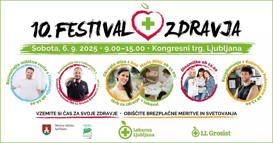 Lekarna Ljubljana v soboto, 6. septembra 2025, med 9. in 15. uro vabi na Kongresni trg, kjer pripravljajo 10. Festival zdravja. Osrednja tema tokratnega festivala je predstavitev dela lekarniških strokovnih delavcev in storitev v lekarnah.