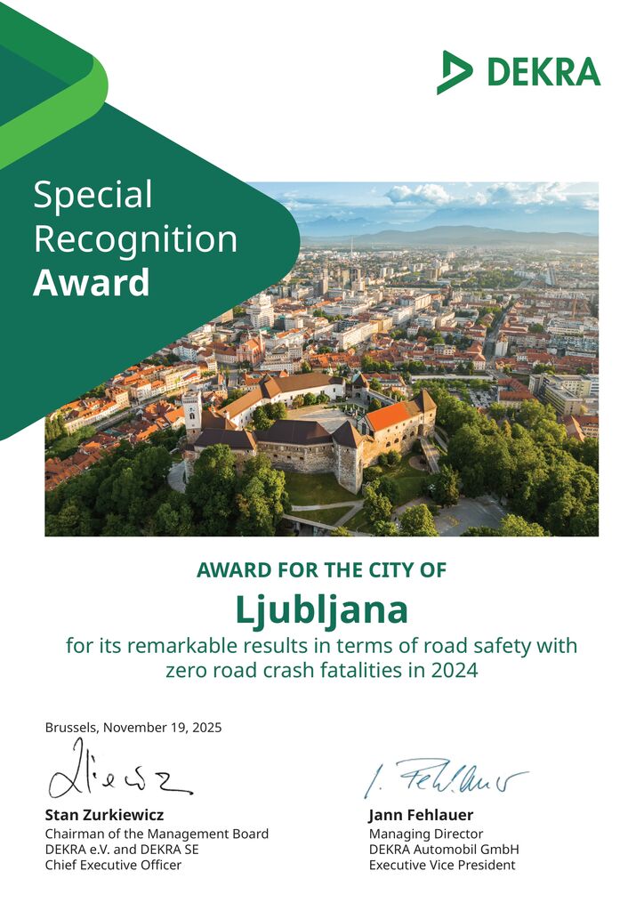 Organizacija za varnost v cestnem prometu DEKRA je Mestni občini Ljubljana podelila priznanje za odlične rezultate na področju zagotavljanja varnosti v cestnem prometu. Tej tematiki smo se posvetili tudi med obiskom posebnega odposlanca generalnega sekretarja Združenih narodov za varnost v cestnem prometu Jeana Todta v Mestni hiši.