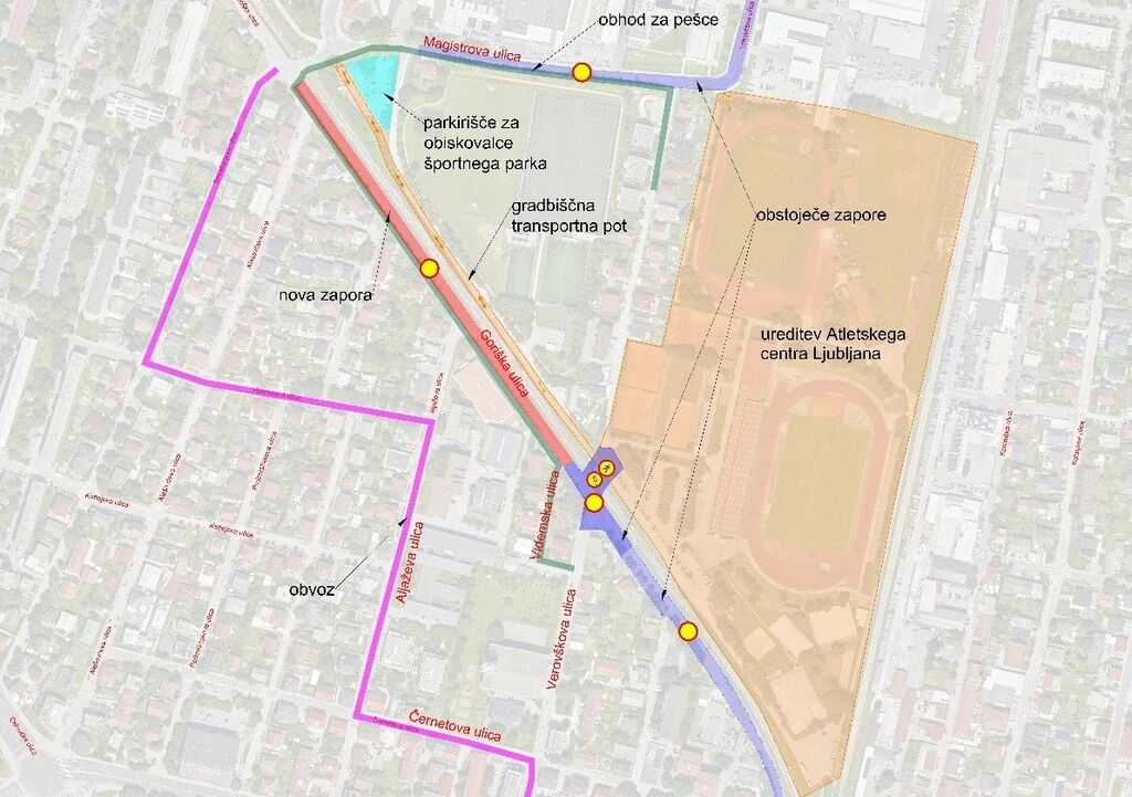 Zaradi gradnje javne infrastrukture v okviru urejanja Atletskega centra Ljubljana bo do predvidoma 12. junija 2026 za ves promet zaprta Goriška ulica med Smrekarjevo in Černetovo ulico, vključno z železniškim prehodom za pešce.