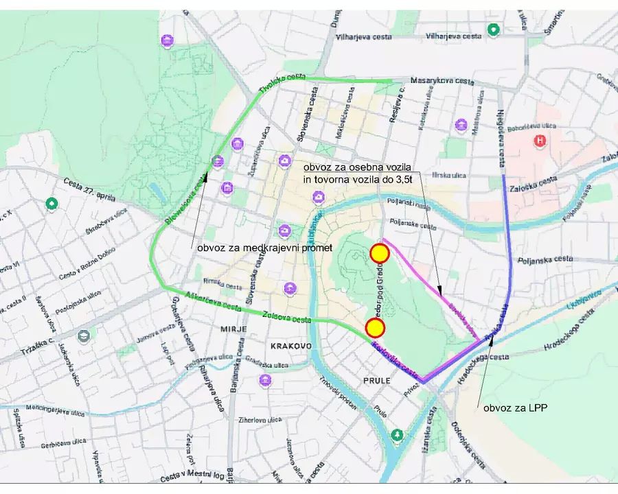 Obvoz za osebna in tovorna vozila do 3,5t bo voden po Karlovški cesti, Roški cesti in Streliški ulici in obratno.