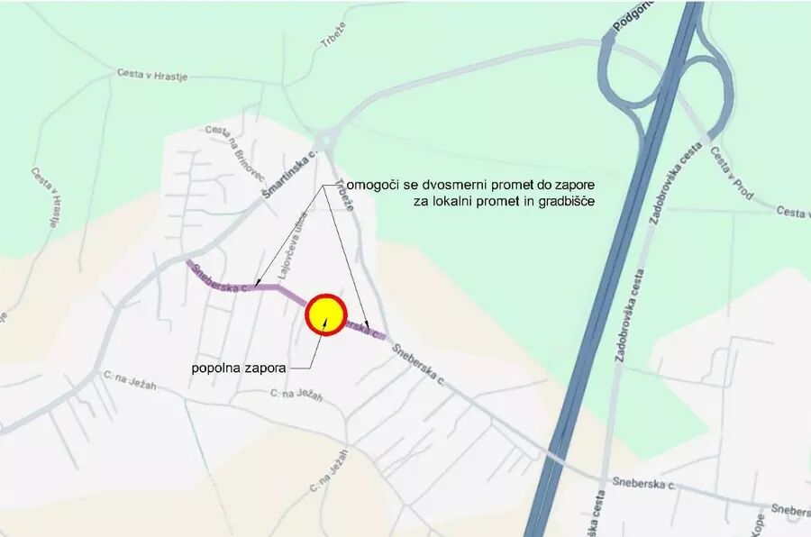 Zaradi izgradnje komunalnega priključka bo od 21. do predvidoma 23. avgusta 2025 za ves promet zaprta Sneberska cesta pri hišni številki 15.