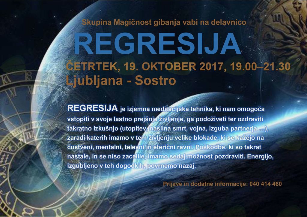 Regresija je izjemna meditacijska tehnika, ki nam s pomočjo angelov omogoča vstopiti v svoje lastno prejšnje življenje, ga podoživeti ter ozdraviti takratno izkušnjo (utopitev, nasilna smrt, vojna, izguba partnerja …), zaradi katerih imamo v tem življenju veliko blokad, ki se kažejo na čustveni, mentalni, telesni in eterični ravni. Poškodbe, ki so takrat nastale, in se niso zacelile, imamo sedaj možnost pozdraviti, energijo, izgubljeno v teh dogodkih, pa povrniti nazaj.
