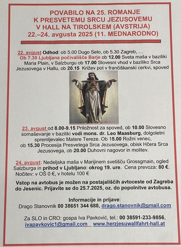 Povabljeni na mednarodno romanje na Tirolsko, ki ga organiziramo skupaj z romarkami in romarji iz Hrvaške. Od leta 2001 organizirajo romanja konec avgusta, ko se v Hallu zberemo romarji iz različnih koncev Avstrije. Letos bo že 25.. Že enajstič pa se jim bomo pridružili romarji iz Hrvaške in Slovenije. Vsi se v treh romarskih dneh združimo v veri in pobožnosti. Srečanje je namenjeno zadoščanju za vse žalitve, ki jih povzročimo Jezusu.