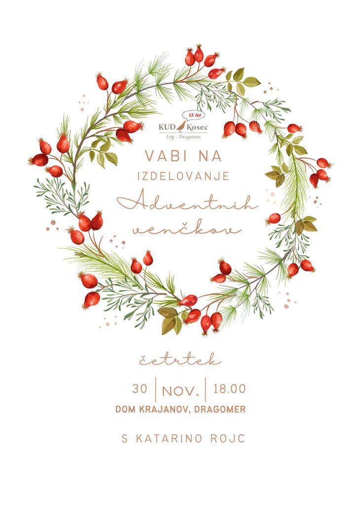 Bliža se adventni čas. Vabimo vas na delavnico izdelave adventnih venčkov, kjer bomo ob toplem čaju malo pokremljali, izmenjali izkušnje ter naredili nekaj adventih venčkov za nas ali naše bližnje. Moderatorka bo ga.Katarina Rojc.