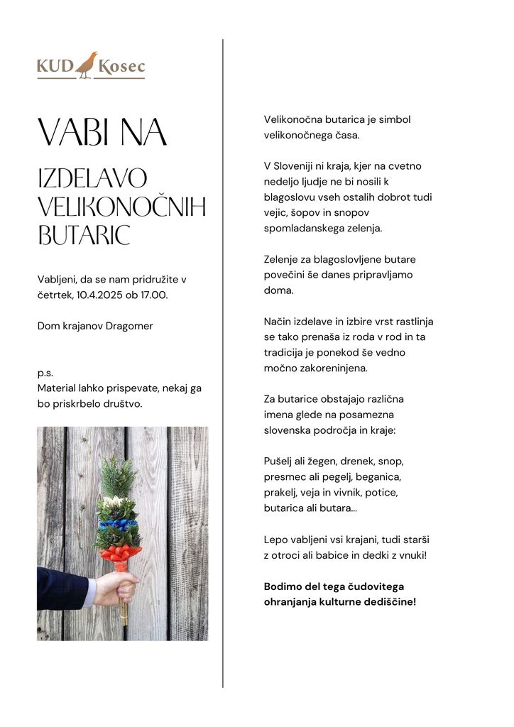 Kontaktni podatki organizatorja: Anica Vengust tel. 031 357 612, kud.kosec@gmail.com.