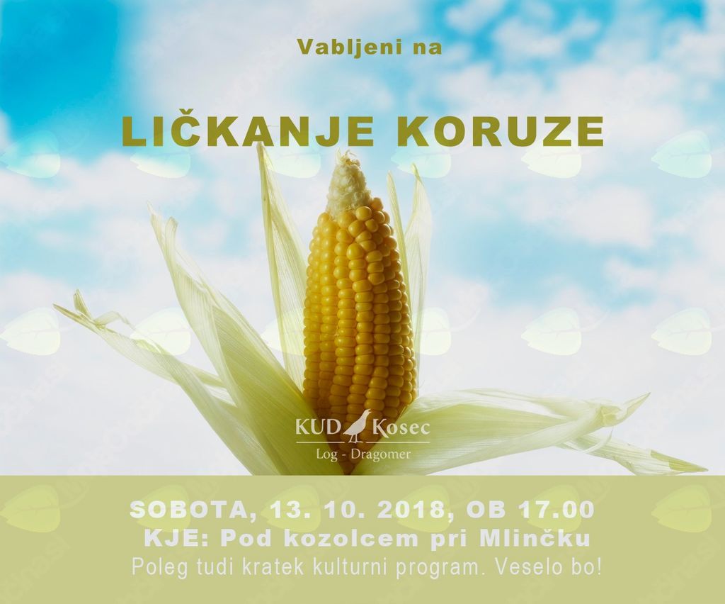 V okviru ohranjanja starih kmečkih običajev in kulturne dediščine našega kraja bomo v soboto 13.oktobra 2018 ličkali koruzo! Zbrali se bomo ob 17:00 uri pod kozolcem pri Mlinčku na Logu, prisluhnili razlagi starih kmečkih opravil, ličkali koruzo vmes kakšno zapeli, morda tudi zaplesali. Poskrbeli bomo, da ne boste žejni in lačni. S seboj prinesite le dobro voljo in no...kakšen priboljšek izpod rok naših vrlih gospodinj tudi ne bo odveč!