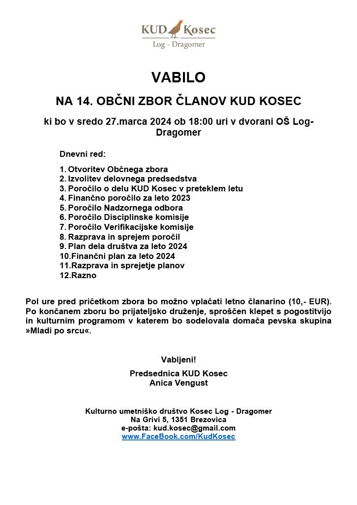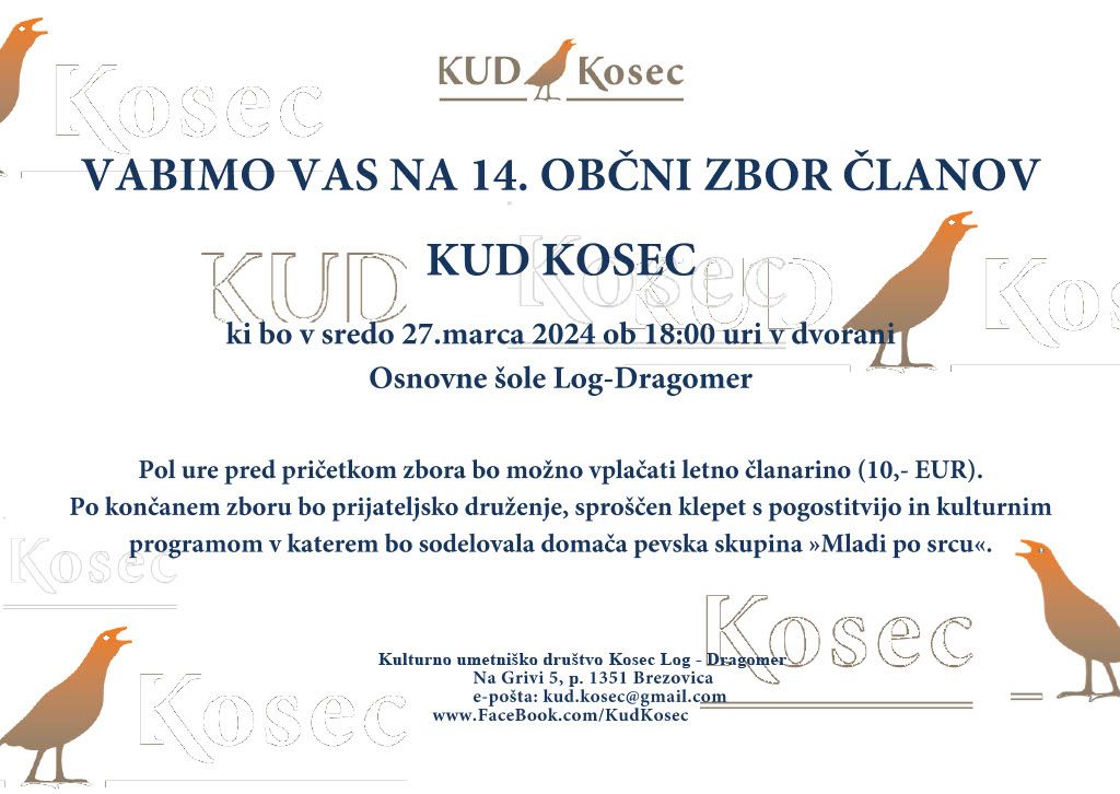 Vabimo vas na 14.občni zbor članov KUD Kosec, ki bo v sredo 27.marca ob 18:00 uri v Osnovni šoli Log-Dragomer