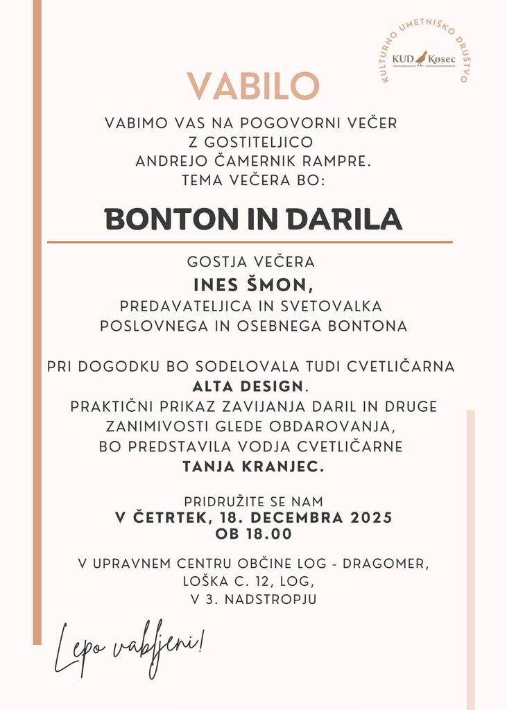 Kontaktni podatki organizatorja: Andreja Čamernik Rampre, kud.kosec@gmail.com.
