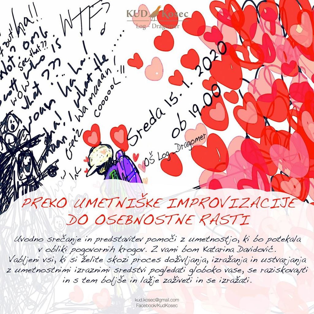 V sredo, 15. 1. 2020, vas ob 19.00 vabimo v OŠ Log - Dragomer ( učilnica št. 10) na predstavitev pomoči z umetnostjo, ki bo ob formiranju skupine potekala v obliki pogovornih krogov, predvidoma ob četrtkih. Skupino bo v okviru svoje študijske prakse vodila Katarina Davidović, dolgoletna članica KUD Kosec in študentka drugega letnika magistrskega študija POMOČ Z UMETNOSTJO.