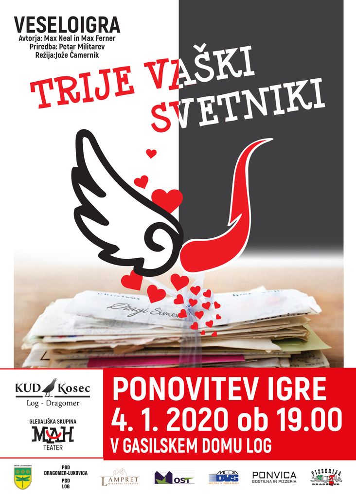 Zaradi izjemnega zanimanja bo v soboto 4.januarja ob 19:00 uri v Gasilskem domu na Logu ponovitev veseloigre "Trije vaški svétniki" v izvedbi MAH Teatra KUD Kosec. Vabljeni!