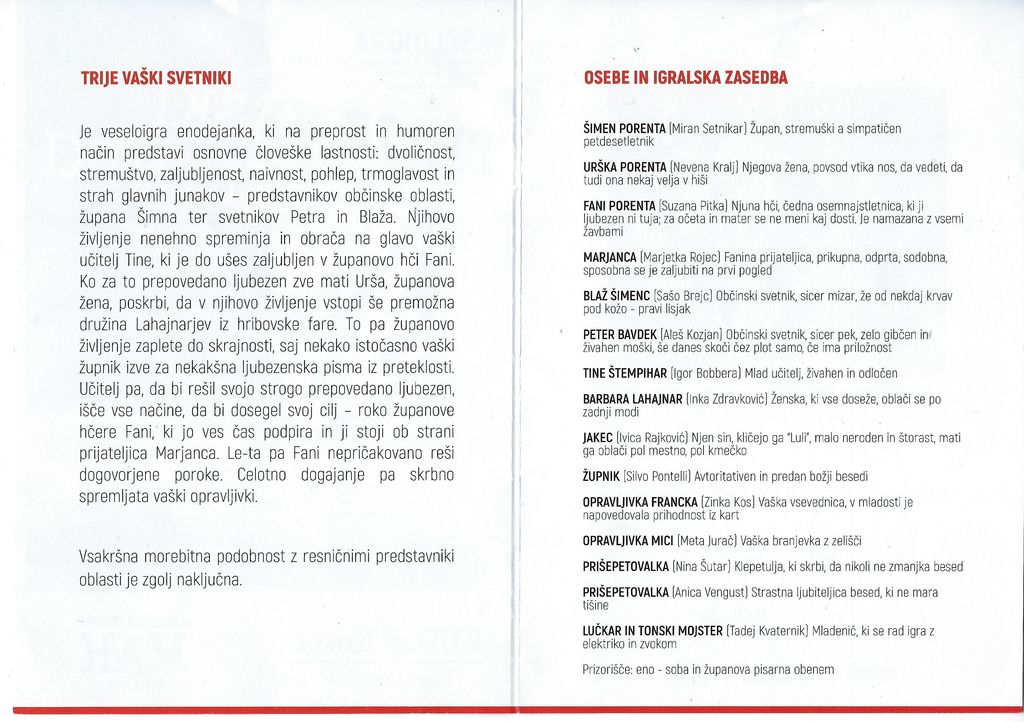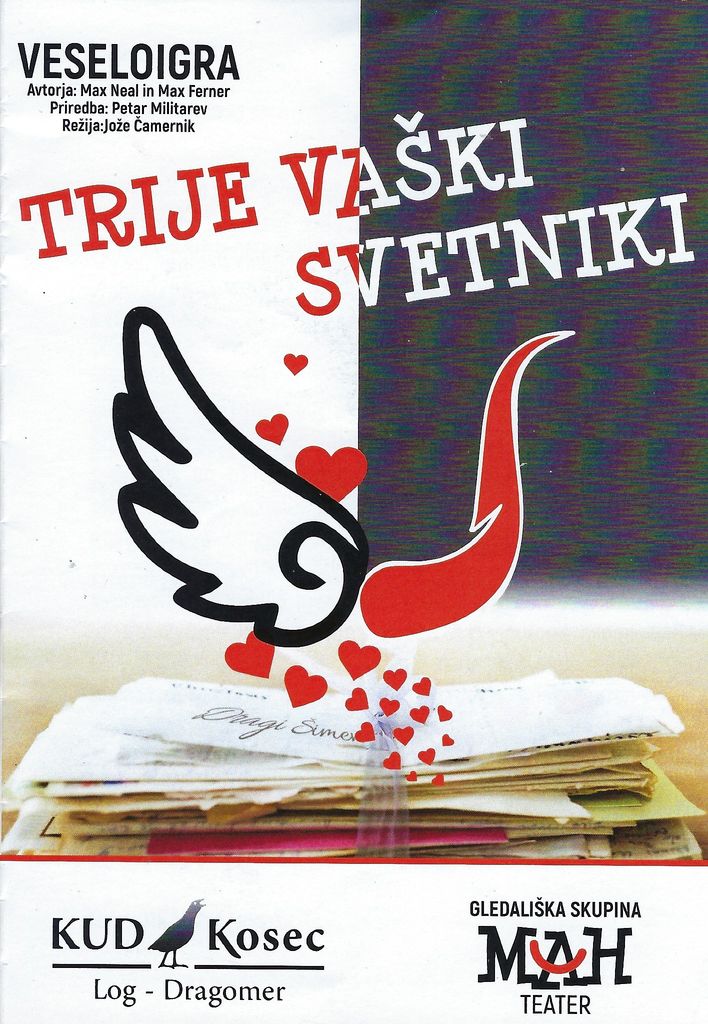 Po izredno uspešni predstavitvi veseloigre "TRIJE VAŠKI SVÉTNIKI" v "domačih logih" (tri razprodane predstave), se MAH Teater, ki deluje pod okriljem KUD Kosec Log-Dragomer, podaja na gostovanja v bližnje kraje. Prvo se bo dogodilo v nedeljo 12.januarja 2020 ob 18:00 uri v Kulturnem domu v Bevkah. VABLJENI, NE BO VAM ŽAL!