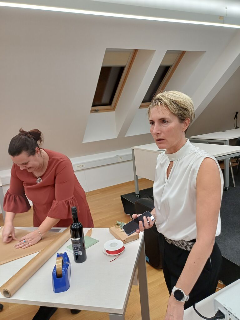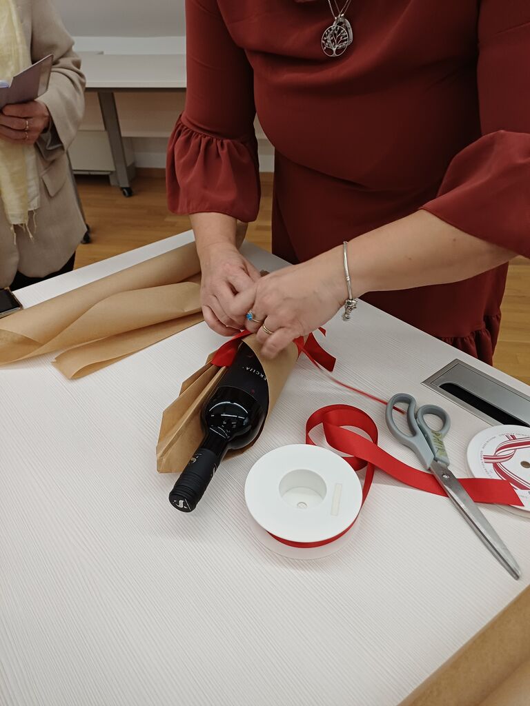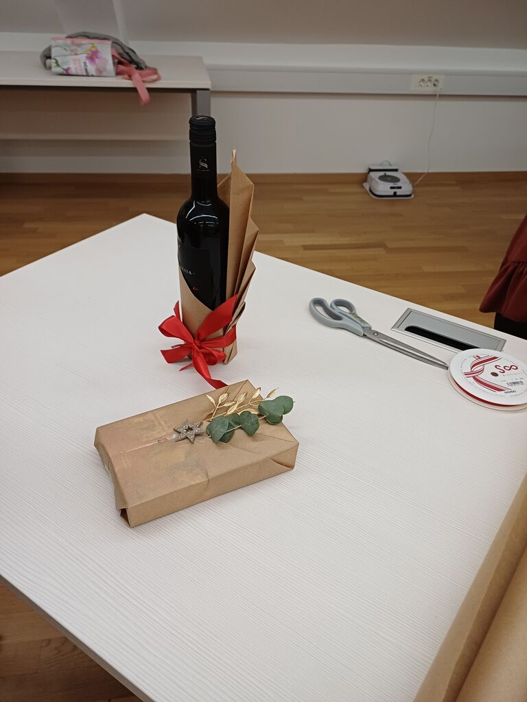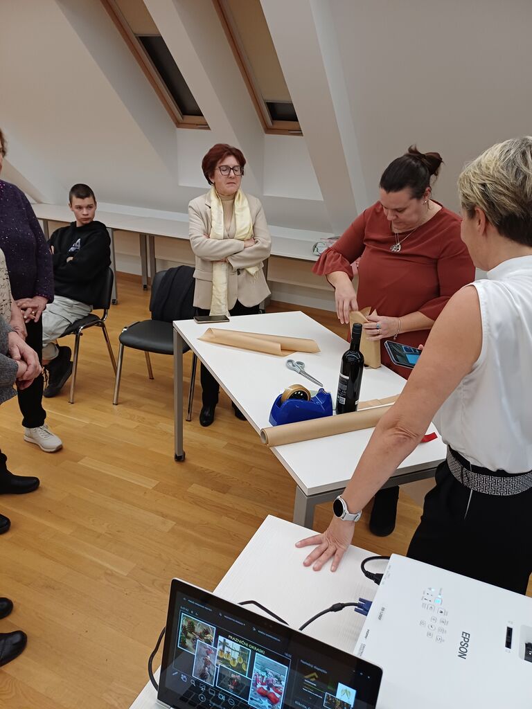 Pomemben poudarek večera je bil namenjen tudi trajnostnemu in domiselnemu zavijanju daril. Razkošna embalaža ni nujna, so se strinjali sogovorniki, saj lahko prav preprostost ustvari poseben »wau učinek«. Uporaba časopisnega papirja, starih koledarjev, papirnatih vrečk, blaga ali celo starih nogavic za steklenice ponuja nešteto možnosti za izvirno zavijanje. Z drobnimi dodatki, kot so vrvica, vejica, suha pomaranča ali ročno napisano sporočilo, darilo dobi osebno noto.
