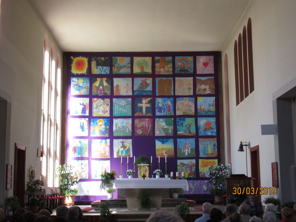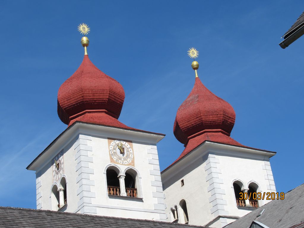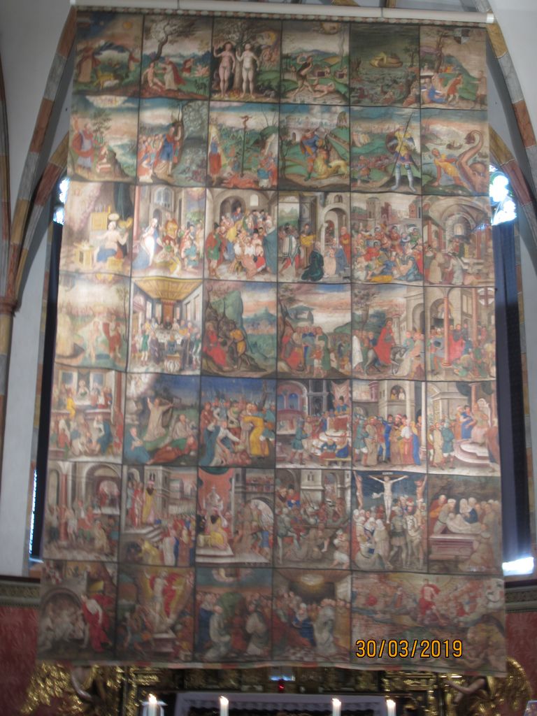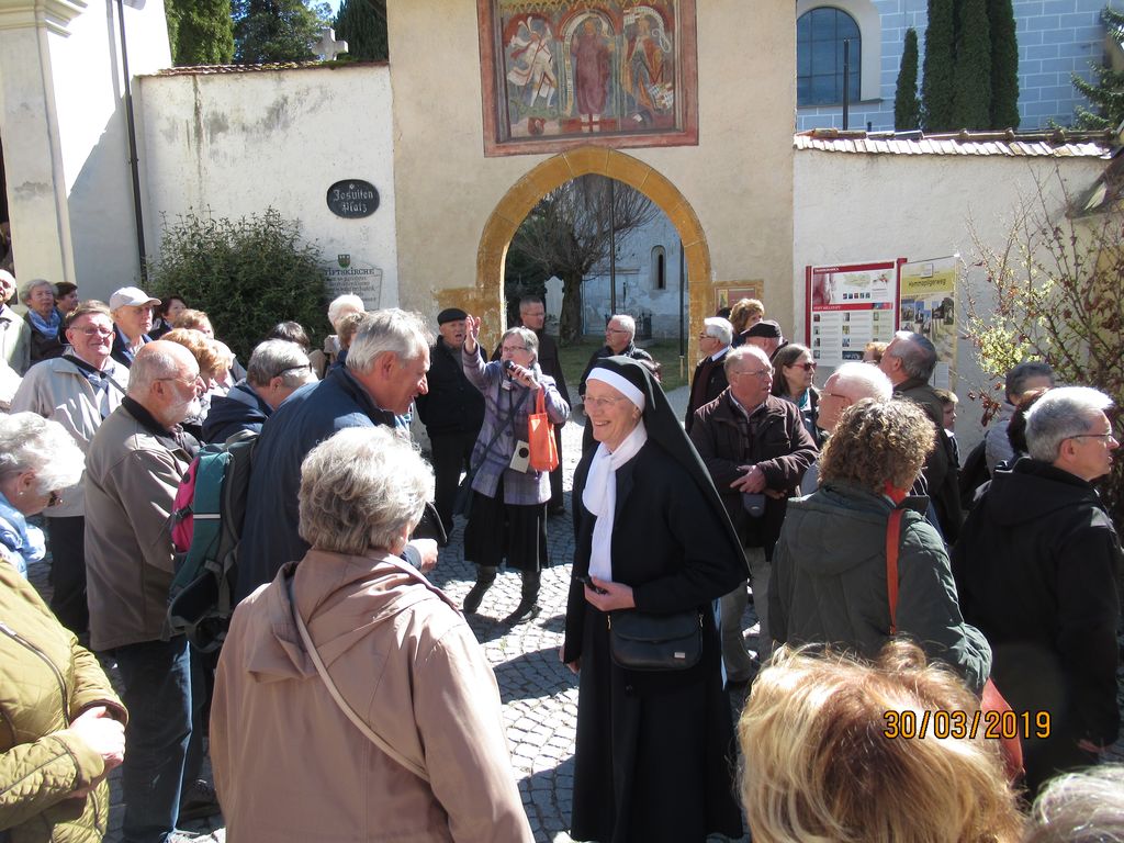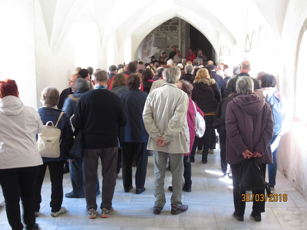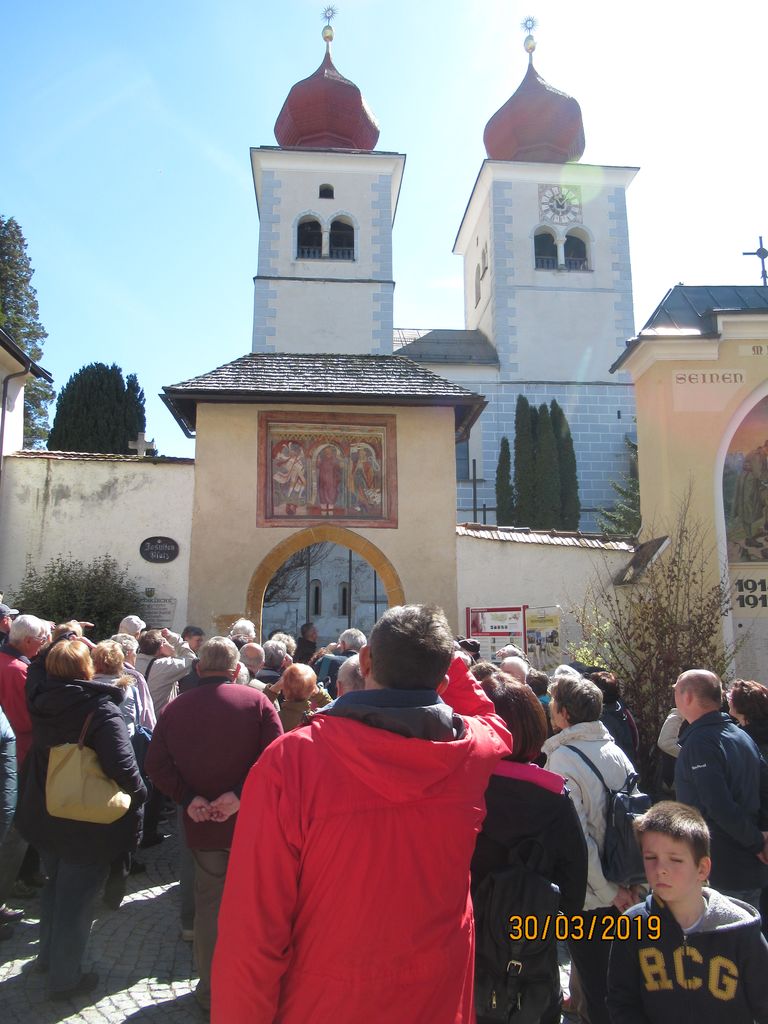 Vodička ga. Ivanka nam je naprej predstavila zgodovino kraja in samostana. Na dvorišču pred samostanom stoji 1000-letna lipa, znotraj pa nekoliko mlajša, 100-letna. Ogledali smo si lepo ohranjen križni hodnik z iz kamna izklesanimi stebri, vsakega s svojim motivom. Le-ti so služili patrom za premišljevanje ob branju brevirja in molitvi. Potem smo nadaljevali v župnijsko cerkev Kristusa Odrešenika in Vseh Svetnikov, kjer je glavni oltar prekrival velik postni prt s prizori stare in nove zaveze Svetega Pisma. V cerkvi smo najprej imeli slovesno sveto mašo, katero je ob somaševanjem ostalih župnikov daroval naš dekan in župnik Mirko Simončič. Po sveti maši nam je ga. Ivanka razložila vsebino postnega prta in povedala nekaj o cerkvi. Sledil je prosti ogled cerkve, kapele sv. Domicijana in tudi zakristije, potem pa smo pri avtobusih imeli skupno malico ter še nekaj prostega časa za sprehod do jezera. Pot smo nadaljevali v JEZERNICO na Miljskem jezeru, kjer smo si v cerkvi Srca Jezusovega ogledali modern postni prt, ki so ga naredili birmanci.