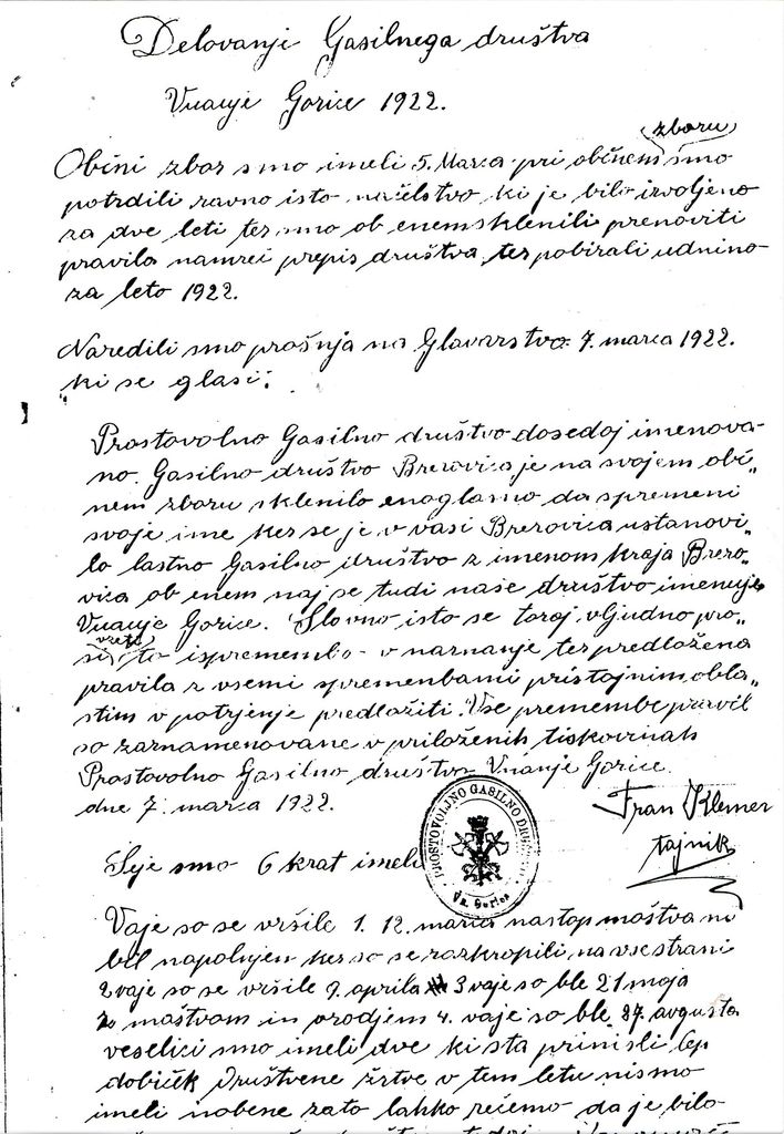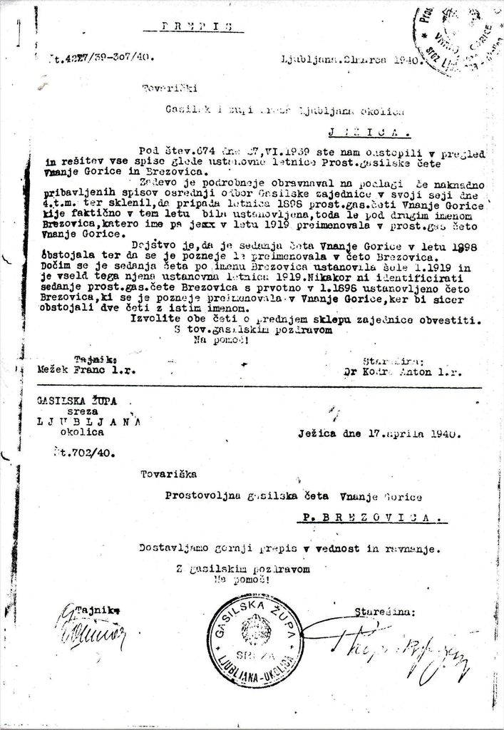 Seveda pa priložena original zapisnika Občnega zbora gasilcev, iz leta 1922 in dopis iz leta 1940 dokazujeta, da sta bili leza 1922 istočasno dve gasilki društvi z istim imenom Brezovica. Novoustanovljeno, krajevno na Brezovici in občinsko, ki je imelo vedno sedež v Vnanjih Goricah. Ta zapisnik zagotovo ni bil predočen odločevalcem, saj drugače ne bi nasedli imenu Brezovica. Z doslednim upoštevanjem zgodovinskih dokumentov res nihče nič ne izgubi ali pridobi. Veliko pa pove o značaju in poštenosti naše generacije. Predvsem pa tudi o spoštovanju delovanja naših prednic in prednikov, ki so in še vedno prizadevno in prostovoljno pomagajo in gradijo krajevno društvo v vsakem kraju.