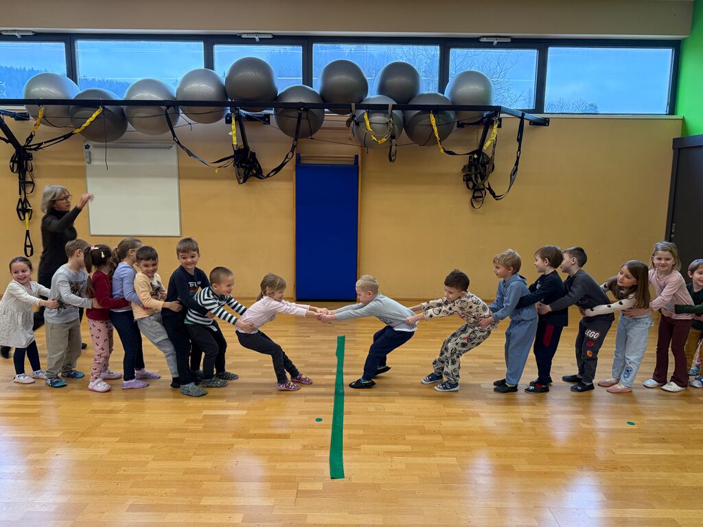 Sledil je gibalni del, prepleten s petjem in igro. Ob pesmi Diradičindara so otroci »vili kačo« in »šivali dreto«, pri čemer so skozi gib in ritem spoznavali preproste, a domiselne oblike skupinske igre. V nadaljevanju so izvedli še več znanih starih iger: Trden most, Mati, koliko je ura? in Škarjice brusit. Igre so zahtevale sodelovanje, pozornost, odzivnost in medsebojno usklajevanje, otroci so jih sprejeli z navdušenjem.