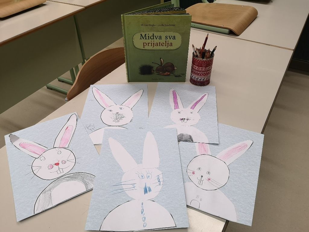 Otroci so se na začetku najprej predstavili, nato pa smo vsi skupaj prisluhnili gospe Tomislavi. V japonski tehniki pripovedovanja pravljic – kamišibaj – nam je povedala kar dve pravljici. Prva je bila ljudska Zajček in repa, druga pa Zlatolaska in dinozavri. Nato je sledilo ustvarjanje. Otroci so iz papirja izrezali glavo, trup in ušesa ter jih nalepili na trši papir. Tako je nastalo cel kup prikupnih zajčkov.