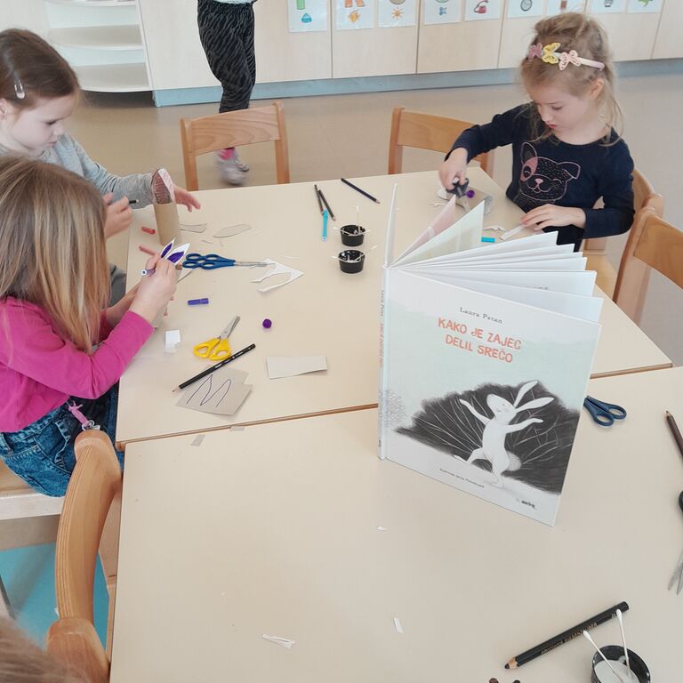 V vrtcu Log - Dragomer je v skupini otrok, starih od 4 do 5 let, potekala prav posebna pravljična urica na kateri so otroci prisluhnili zgodbi Laure Petan Kako je zajec delil srečo, ki na topel in razumljiv način odpira pomembne življenjske teme o deljenju, prijateljstvu in sreči.