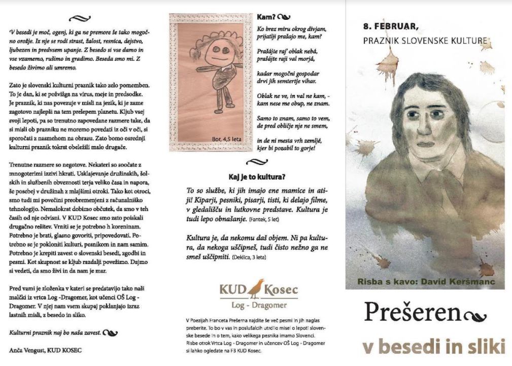 KUD Kosec je v počastitev slovenskega kulturnega praznika izdal zloženko z risbami na temo Prešerna in njegovih pesmi, ki so jih pripravili naši najmlajši.