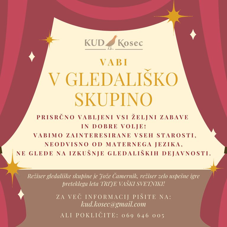 Prisrčno vabljeni vsi željni zabave in dobre volje. Vabimo zainteresirane vseh starosti, neodvisno od maternega jezika, ne glede na izkušnje gledaliških dejavnosti.