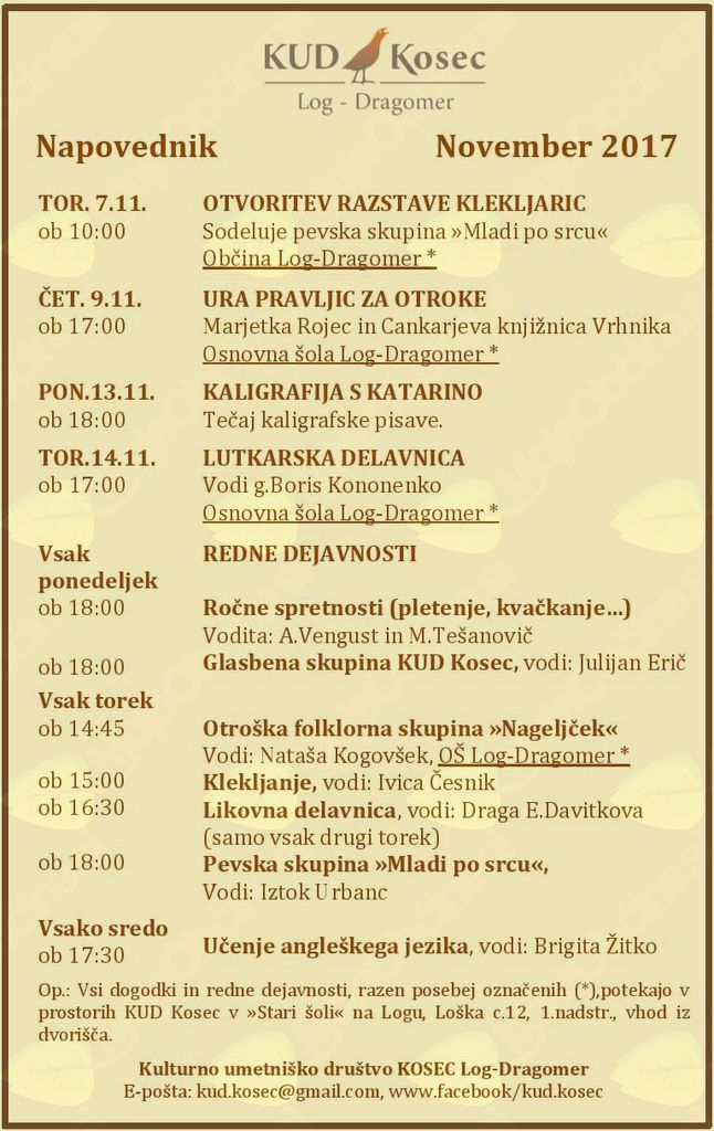 Zakorakali smo v jesen, naš KUD Kosec pa nadaljuje s svojimi aktivnostmi, zato vas vabimo, da se nam pridružite pri ročnih spretnostih, klekljanju, likovnem ustvarjanju, poslušanju pravljic, plesu, glasbi, petju ali učenju.