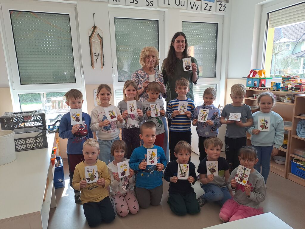 Načrt, kako razveseliti mamice za letošnji praznik, so otroci z vzgojiteljico Leo in Tajo pripravili že lani. Odločili so se, da bodo sami ustvarili čestitke, pa ne običajne, ampak prav posebne, take s posušenim travniškim cvetjem, ki ga lahko od pomladi in vse do zime gledajo na domačih travnikih in obrobjih gozdov. Za to pa so potrebovali ne samo pomoč vzgojiteljic, ampak povsem nove veščine, in voljo, da se jih pravočasno naučijo. Lea je povabila Milko Erbežnik, mentorico Društva DVIG, da nauči otroke izdelovati voščilnice iz suhega cvetja. Milka je prinesla veliko raznovrstnega in raznobarvnega suhega cvetja in vse, kar je potrebno za izdelavo voščilnice: papir, lepilo, zobotrebce…, postavila na ogled nekaj svojih voščilnic, pokazala, kako z zobotrebci nanašati tanke plasti lepila na večje ali povsem majhne cvetove. Otroci pa so nato sami izbirali cvetje in kar hitro osvojili tudi zahtevno prijemanje cvetja s prstki in nanašanje lepila na cvetje z zobotrebci. In prav vsi so že znali šteti do 10, to je potrebni čas, da se lepilo posuši. Na treh delavnicah so ustvarili 16 čestitk, za svojo mamo jo je naredila tudi Lea.