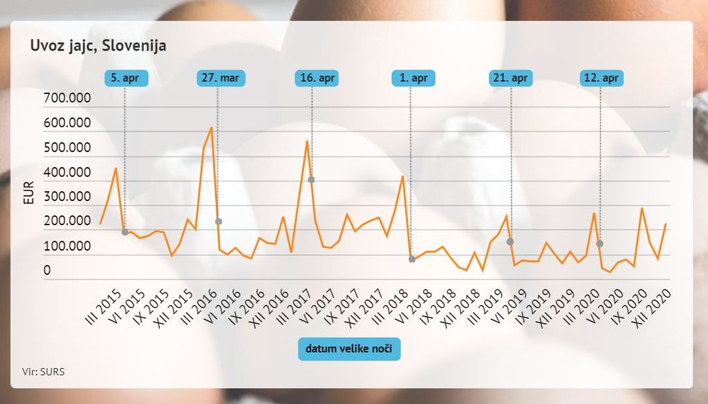 Slovenija je v 2020 (po začasnih podatkih) izvozila za 4,3 milijona evrov jajc, uvozila pa jih je za 1,4 milijona evrov. Izvozila jih je največ v Hrvaško (85 %), uvozila pa iz Slovaške (26 %). Uvoz jajc je izrazito odvisen od sezone, ta sezona pa je praviloma vedno marca ali aprila, torej okoli velike noči.