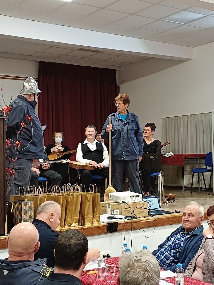 Dogodek je popestrila tudi ponovitev skeča, ki so ga veterani premierno predstavili na praznovanju 70-letnice Gasilske zveze Vrhnika v Cankarjevem domu. Besedilo, ki ga je napisala veteranka PGD Log Helena Kavčič, sta izvrstno uprizorila veterana Slavka Gardina iz Prostovoljnega gasilskega društva Breg in Janez Cankar iz Prostovoljnega gasilskega društva Podlipa ter s humorjem in toplino nasmejala občinstvo.