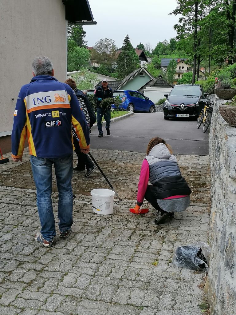Tik pred zaključkom akcije so oblaki popustili pod težo in pričelo je deževati. Pohiteli smo s pospravljanjem orodja in bili veseli, da smo uspešno izvedli delovno akcijo. Dež nam ni pokvaril prijetnega razpoloženja, za kar je poskrbela prijetna glasba in še omamne vonjave z žara. Ob prijetnem druženju smo se okrepčali, poklepetali pa tudi malo zaplesali.