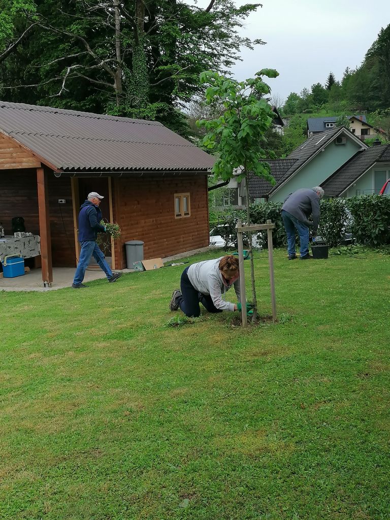 Nič kaj obetavna vremenska napoved nas ni odvrnila od načrtovanega srečanja. V sredo, 10. maja, se je vabilu na delovno akcijo v sklopu čajanke odzvalo 20 članov. V oblačnem jutru smo pred lopo popili jutranjo kavico in čaj, nato pa smo se brez nepotrebnega posedanja lotili dela. Večji del udeležencev je poprijelo za delo v okolici doma. Opleli so dovozno pot in robnike ter oprali tlakovani del dvorišča. Z odstranitvijo plevela so pridobile osvežitev tudi trajnice med škarpniki in ob ograji, tudi naša lipa je bila deležna pozornosti pridnih rok. Košnja ni bila potrebna, saj nas je s tem opravilom prehitel ter presenetil podnajemnik in naš član Drago. Tudi lopa je bila deležna naše pozornosti. Nekaj članov se je posvetilo montaži zaključnih opažnih letvic na nosilne stebre in tako zaključilo z delom na notranjih stenah. Groba dela v lopi bo potrebno zaključiti še z montažo stropnega dela, glede tega pa je med našimi spretnimi člani že stekel pogovor o idejah in izvedbi.