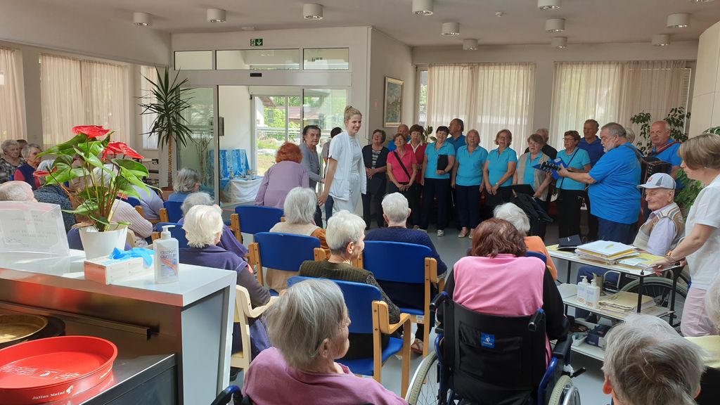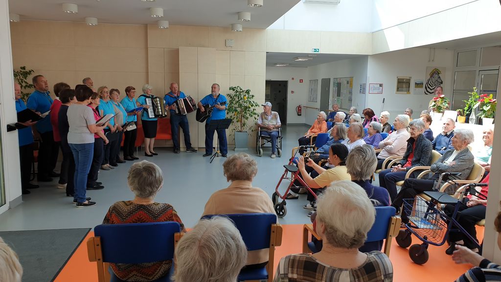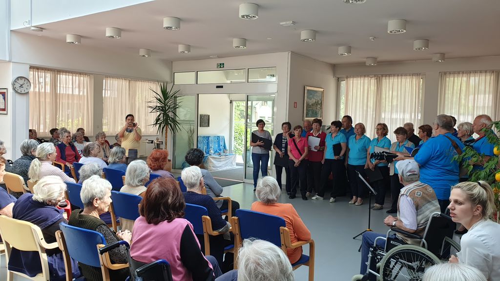 Tokrat smo obiskali Dom starejših občanov v Horjulu. Na lepo sončno petkovo dopoldne smo nekaj dodatnega sonca in topline vnesli med oskrbovance doma in jim skušali malce popestriti vsakdan. Po obrazih oskrbovancev in spontanem aplavzu sodeč nam je to lepo uspelo. Slaba urica slovenskih ljudskih pesmi je kar prehitro minila. Seveda so oskrbovanci tudi zapeli z nami, zlasti pri zadnji »Mi se 'mamo radi«. »Pa še pridite!« so se poslovili od nas.