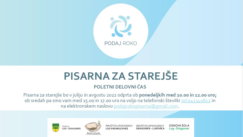 Pisarna za starejše bo v juliju in avgustu 2022 odprta ob ponedeljkih med 10.00 in 12.00, ob sredah pa smo vam med 15.00 in 17.00 na voljo na telefonski številki 041 349 812 in na elektronskem naslovu podajrokopisarna@gmail.com.