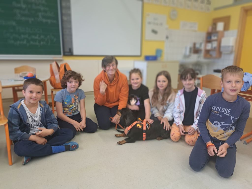 ki so vsak mesec prihajali na urice branja. Kuža pri branju učence posluša, je
