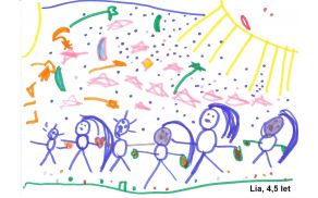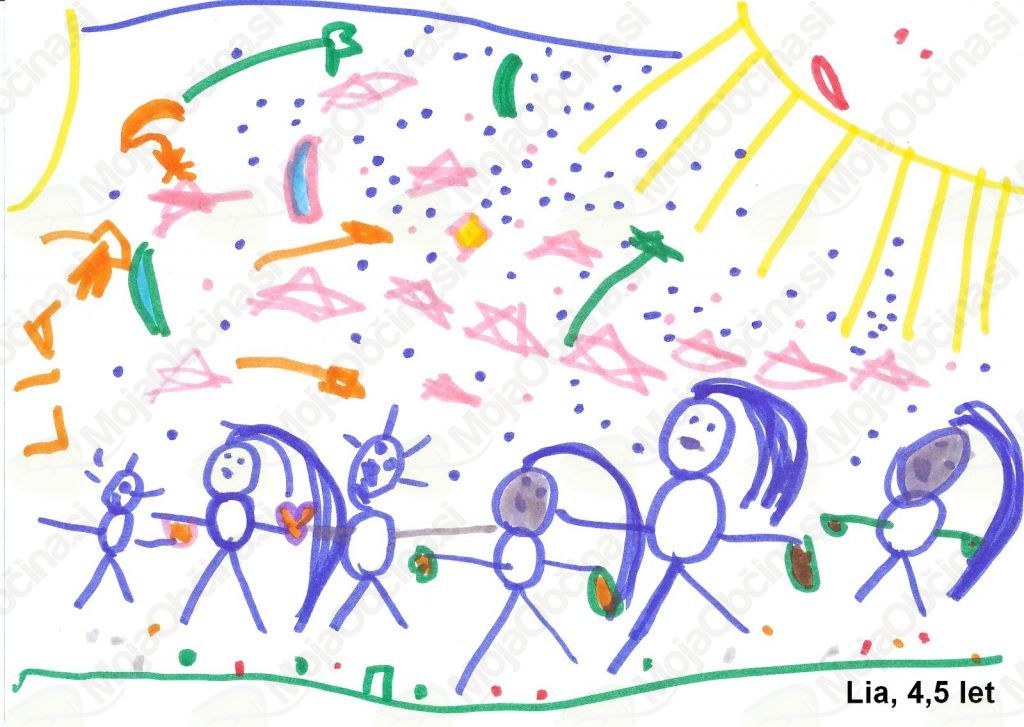 Predšolski vhod je čakala večja površina travnika. Otroci so s seboj prinesli grablje in grabili listje, z rokami pa so pobrali veje; vsega skupaj je bilo za poln veliki zabojnik, ki ga je pripravil naš hišnik. Večjega smo torej napolnili z bioodpadki, malo manjšega pa smo skoraj napolnili s kamenjem, ki so ga otroci pridno pobirali po vsej površini dvorišča. Kresničke smo vzele plastične vrečke, na eno roko smo si nadele zaščitne rokavice za enkratno uporabo in šle okoli vrtca pobirat smeti. Z otroki smo obkrožili vrtec in se odpravili vse do občine ter teniškega igrišča. Kresničke so ugotovile, da je največ papirčkov prav ob robu igrišča, ki meji na parkirne prostore. Dogovorili smo se, da ko bomo šli v svoje avtomobile, ne bomo začeli smetiti. Največ odpadkov ljudje zavržejo, ko se pripeljejo ali gredo domov. Na travnatih površinah smo tako pobrali vse možne odpadke ter z njimi napolnili kar deset plastičnih vrečk, pa vanje ne gre tako malo. Vse odpadke smo odložili v zabojnike za ograjo, ki je bila v ta namen odprta. Odvrgli smo jih v koše za nekoristne odpadke. Ogledali smo si tudi koš za pasje iztrebke. Naš dogovor je bil: če bo čistil vsak za seboj, bodo čistilne akcije nepotrebne. Z odpadki sicer onesnažujemo tudi zrak, in ne le zemlje. Čistilno akcijo smo tudi narisali.