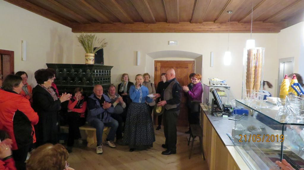 Ko sta naša člana Helena in Marjan predlagala, da bi si na naslednjem izletu ogledali objekte Rupnikove linije in se zapeljali v Poljansko dolino, nama je bila ideja takoj všeč. Tako smo se neko popoldne štirje odpeljali na oglede. Z gospo Lucijo, ki je v občini Gorenja vas - Poljane zadolžena za turizem v dolini, smo se dogovorili za kavo. Opisala in predstavila nam je, kaj si lahko ogledamo. Ko nam je pripovedovala o živahnem kulturnem življenju v dolini in povedala, da je tudi sama amaterska igralka, je odločitev padla – na spomladanski izlet gremo v Poljansko dolino. Tako smo se člani DU Log v torek, 21. maja, odpeljali na izlet. Skoraj poln avtobus upokojencev se je pripeljal na Visoko v Tavčarjev dvorec, kjer nas je v svoji opravi že čakala Meta iz Cvetja v jeseni. Prek kratkim so odprli prenovljeno kavarno v dvorcu in privoščili smo si kavico. Meta oziroma ga. Lucija je poskrbela za veselo vzdušje in nas z igro popeljala v pretekli čas. Med našimi člani si je poiskala »svojega Janeza« in ga našla v Marku. Skupaj sta odigrala odlomek iz Cvetja v jeseni. Še preden smo se poslovili od Mete, nas je z borovničkami presenetila članica Nevenka, ki je pred kratkim praznovala okrogli rojstni dan.