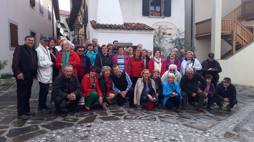 Avtobus nas je tik pred dežjem popeljal čez Solkanski most s prelepim razgledom na največji kamniti most na svetu ter pod njim turkizno obarvano reko Sočo. Cesta se je vijugasto vzpenjala in neopazno smo prestopili mejo po Ozimski cesti. Zaradi dežnih kapljic smo časovno malo spremenili naš program in se najprej ustavili na domačiji Bizjak v Gonjačah. Kar pa nam seveda ni bilo preveč težko, saj nam je stregel njihov sin, ki je bil letos med kandidati v oddaji Ljubezen po domače. Škoda, ker nismo imeli maturantskega izleta, ampak upokojenskega. Ko smo se okrepčali, smo nekateri zaplesali, drugi zapeli, spet tretji pa so se povzpeli na 230 m visok razgledni stolp po 144 stopničkah. Razgled je bil malce slabši zaradi vremena, za utrjevanje mišic pa je bilo ravno prav.