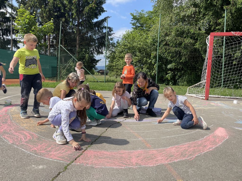 V okviru Tedna ljubiteljske kulture in Tedna vse življenjskega učenja, ki je potekal od 15. maja do 19. junija, so se otroci vrtca iz občine Log-Dragomer, preizkusili v risanju na asfaltu s kredami. V ta namen so zasedli športno igrišče v Dragomeru in ga uporabili za svoja slikarska platna. Tema, na katero so ustvarjali individualno ali v parih, je bila »Pozdrav poletju« . Delavnice so se udeležili prav vsi otroci, od najmlajše do najstarejše skupine. Na asfaltu so tudi izpod spretnih prstov naše likovne mentorice Drage Davitkove in vzgojiteljic iz vrtca nastale prave pisane umetnine, katerih skupna točka je bila poletje, sonce in morje. Najmlajši otroci so pešpot do vrtca okrasili s prepletenimi slikami morja. Pogled na pešpot je bil resnično mavrično obarvan. Športno igrišče so pokrivali motivi z morskimi živalmi in soncem.
