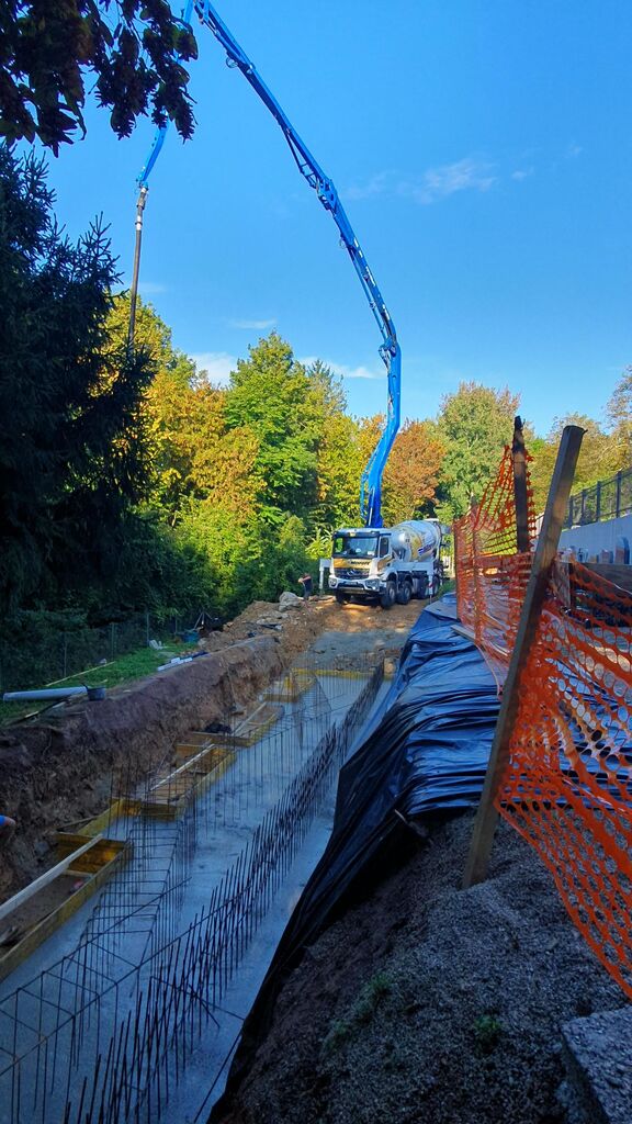 Po dokončanih temeljih je izvajalec postavil enostranski opaž AB opornega zidu, izvedel armiranje, zaprl konstrukcijo in betoniral prvi dve kampadi zidu, so pojasnili na Občinski upravi Občine Log – Dragomer. V prihodnjih tednih bo sledilo opaževanje, vgrajevanje armature in betoniranje temeljev ter zidu tretje kampade.