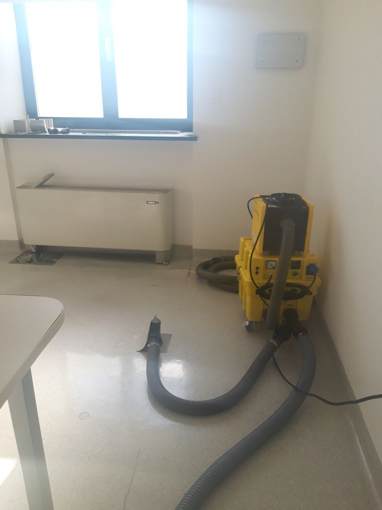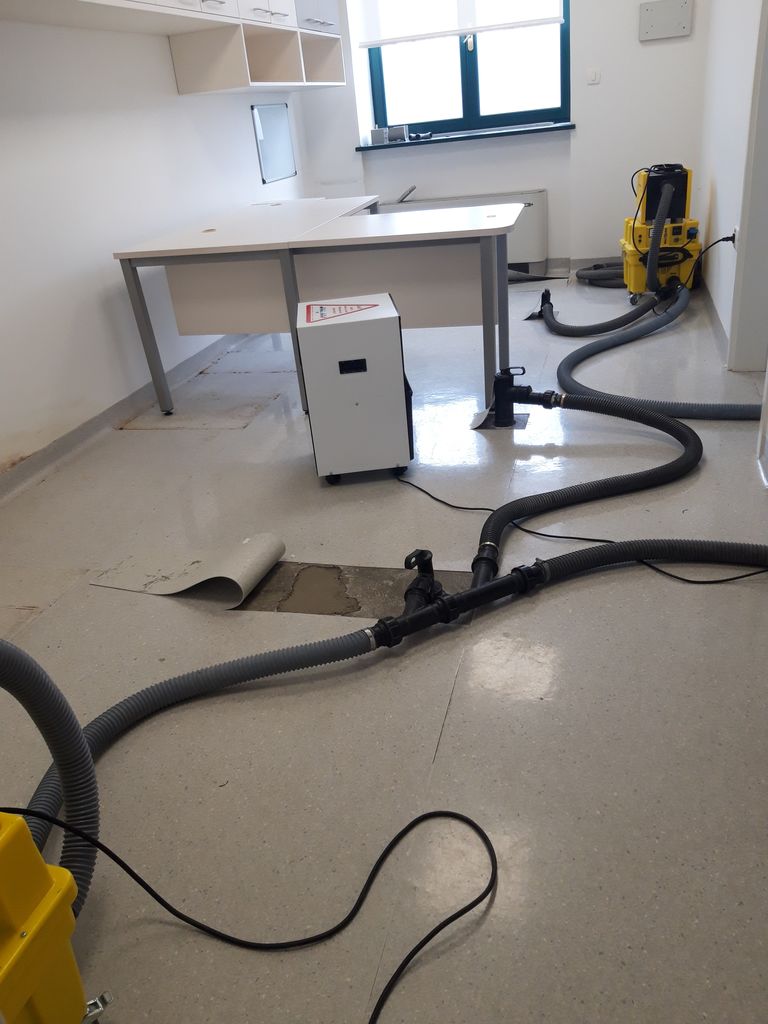 Zaradi zadrževanja vlage v objektu so strokovnjaki uporabili napredno termokamero, ki je pokazala prisotnost vode, ujete med AB ploščo in estrihom. Sušenje se izvaja s kombinacijo silikagelnih sušilnikov, turbinskih puhal ter zračnih razvlaževalnikov, ki vpihujejo suh in topel zrak med estrih ter osnovno ploščo, medtem ko se odvečna vlaga odvaja s kondenzacijskimi razvlaževalniki. Po ocenah bo ta postopek trajal približno 18 dni.