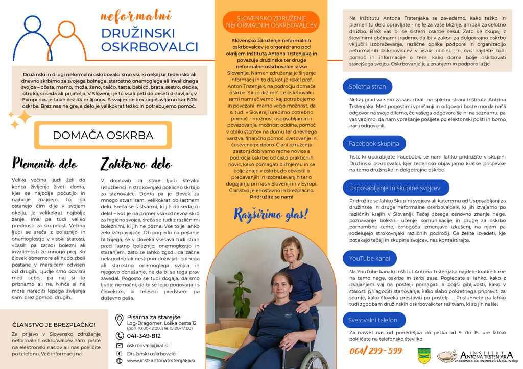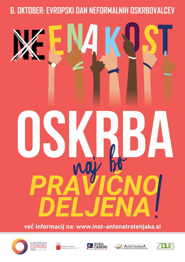 V Sloveniji skoraj 400.000 ljudi skrbi za svoje starostno onemogle, bolne, invalidne družinske člane, prijatelje ali znance. Imenujejo se družinski oskrbovalci. Brez njih ne gre, ampak potrebujejo pomoč – možnost usposabljanja, možnost oddiha, pomoč v obliki storitev na domu, finančno pomoč, svetovanje in čustveno podporo. Razširimo glas družinskih oskrbovalcev in jih podprimo v njihovih prizadevanjih!