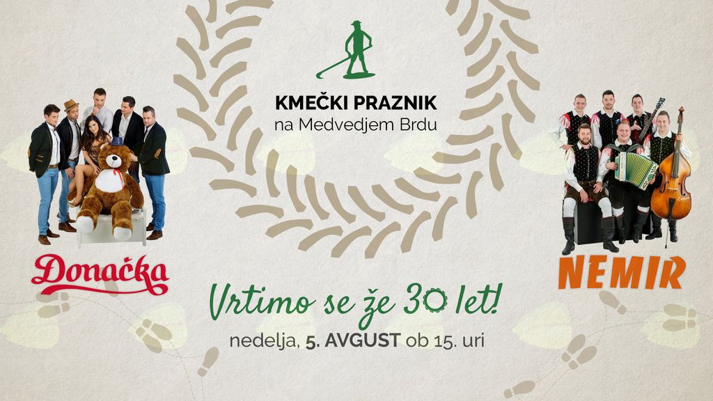 »Vrtimo se že 30 let!« je geslo letošnjega 30. jubilejnega Kmečkega praznika na Medvedjem Brdu, ki bo 5. avgusta 2018 od 15. ure dalje na prizorišču med CŠOD dom Medved ter cerkvijo sv. Katarine. Geslo zaobjema tako programski del, ki bo posvečen kolesu in 30. obletnici prireditve, kot tudi večerni zabavni del, kjer se boste vsi obiskovalci lahko zavrteli na plesišču.