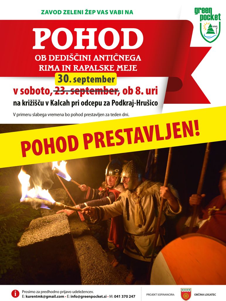 Zavod Zeleni Žep vas vabi na 8. Pohod ob dediščini antičnega Rima in rapalske meje. Po stari rimski cesti do Lanišča (rimska trdnjava 4. stoletje) in naprej, do ostalin Alpskega zidu, kjer bo predstavljena rimska vojaška oprema. Od tu se vračamo do izhodiščne točke.